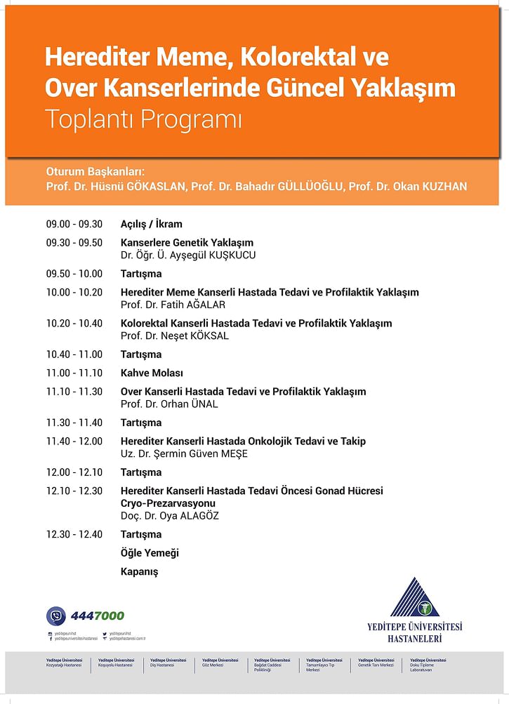 Yeditepe Üniversitesi Koşuyolu Hastanesi Konferans salonunda 28 Şubat 2019 09.00 - 13.00 saatleri arasında gerçekleşecek olan ''Herediter Meme, Kolorektal ve Over Kanserlerinde Güncel Yaklaşım'' toplantısında, Tıbbi Genetik Anabilim Dalı Başkanı Dr. Öğr. Üyesi Ayşegül Kuşkucu, Genel Cerrahi Prof. Dr. Neşet Köksal, Kadın Hastalıkları ve Doğum Uzmanı Prof. Dr. Orhan Ünal,Kadın Hastalıkları ve Doğum Bölümü Tıbbi Histoloji ve Embriyoloji Uzmanı Doç. Dr. Oya Alagöz, Herediter Meme, Kolorektal ve Over Kanserlerine karşı güncel yaklaşımlarını izleyicilerle paylaşacak.