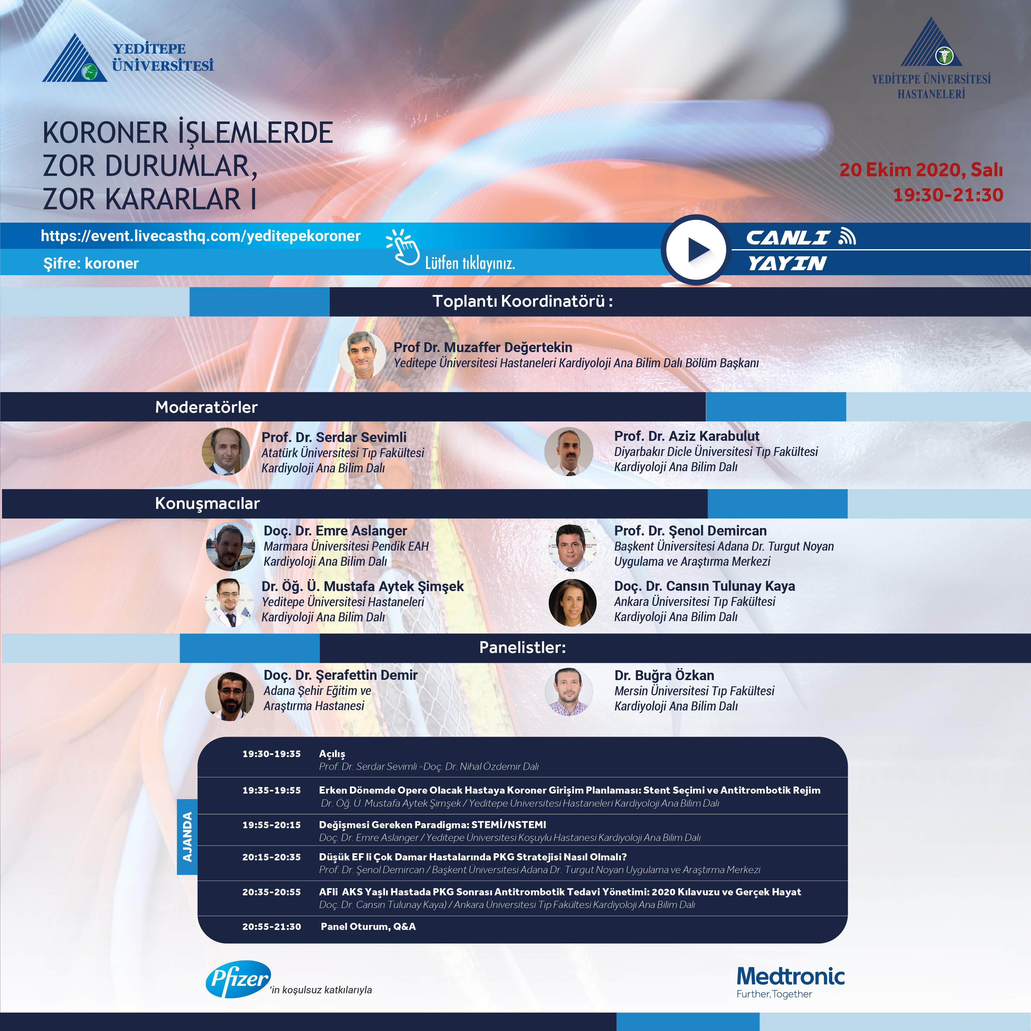 Moderatörlüğünü Yeditepe Üniversitesi Hastaneleri Kardiyoloji Anabilim Dalı Başkanının yapacağı, 20 Ekim 2020 Salı günü gerçekleşecek, Koroner Girişimlerde Zor Durumlar Zor Kararlar I başlıklı online konferansa katılabilirsiniz.