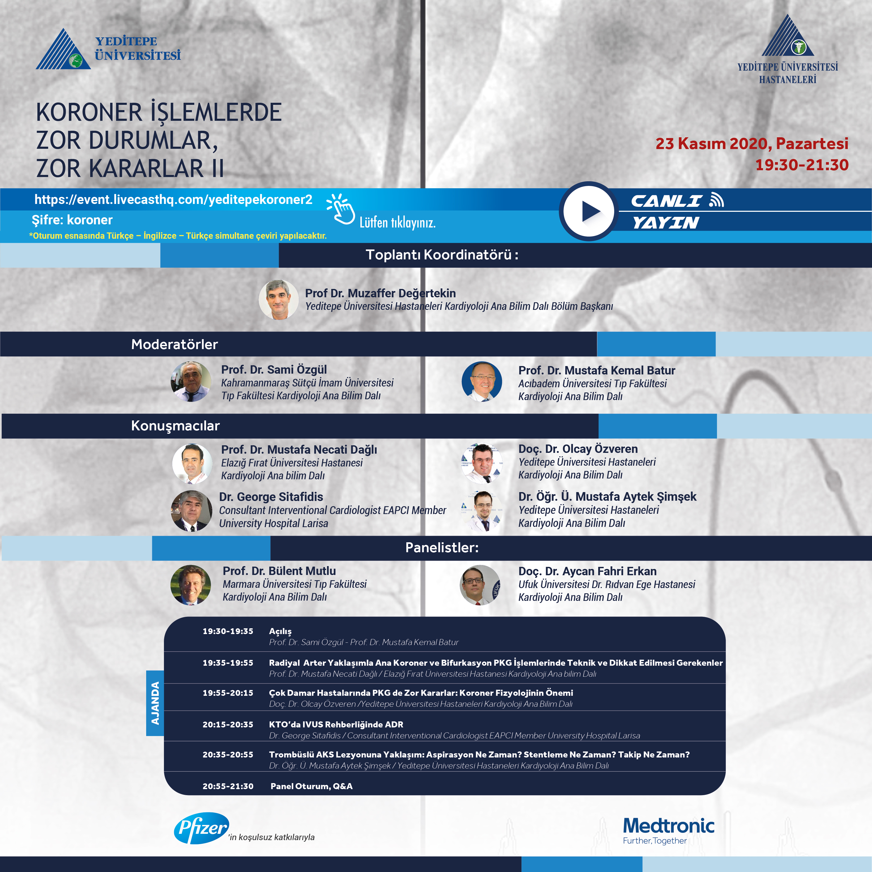 Moderatörlüğünü Yeditepe Üniversitesi Hastaneleri Kardiyoloji Anabilim Dalı Başkanın yapacağı, 23 Kasım 2020 Salı günü gerçekleşecek, Koroner Girişimlerde Zor Durumlar Zor Kararlar II başlıklı online konferansa katılabilirsiniz.