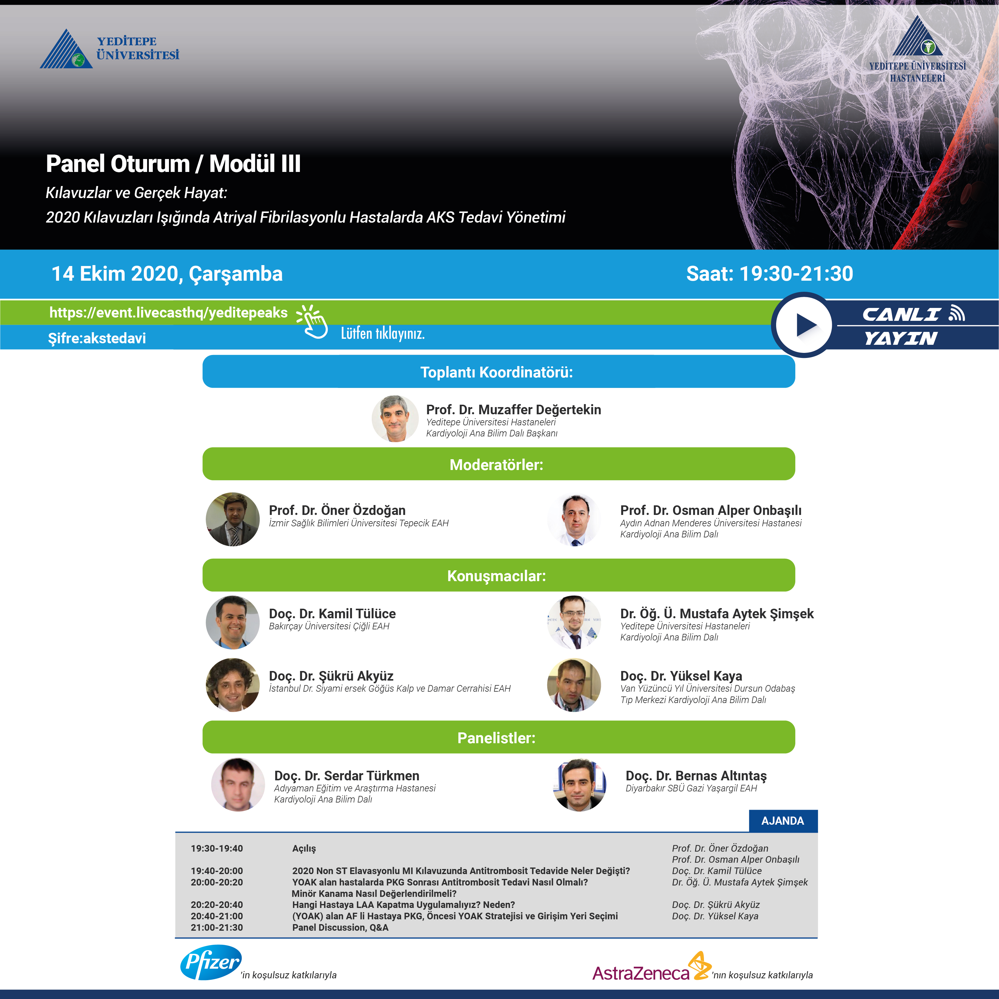 Moderatörlüğünü Yeditepe Üniversitesi Hastaneleri Kardiyoloji Anabilim Dalı Başkanının yapacağı, 14 Ekim 2020 Çarşamba günü gerçekleşecek,Kılavuzlar ve Gerçek Hayat 2020 Klavuzları Işığında Atriyal Fibrilasyonlu Hastalarda AKS Tedavi Yöntemi Panel Oturum - Modül III online konferansa katılabilirsiniz.