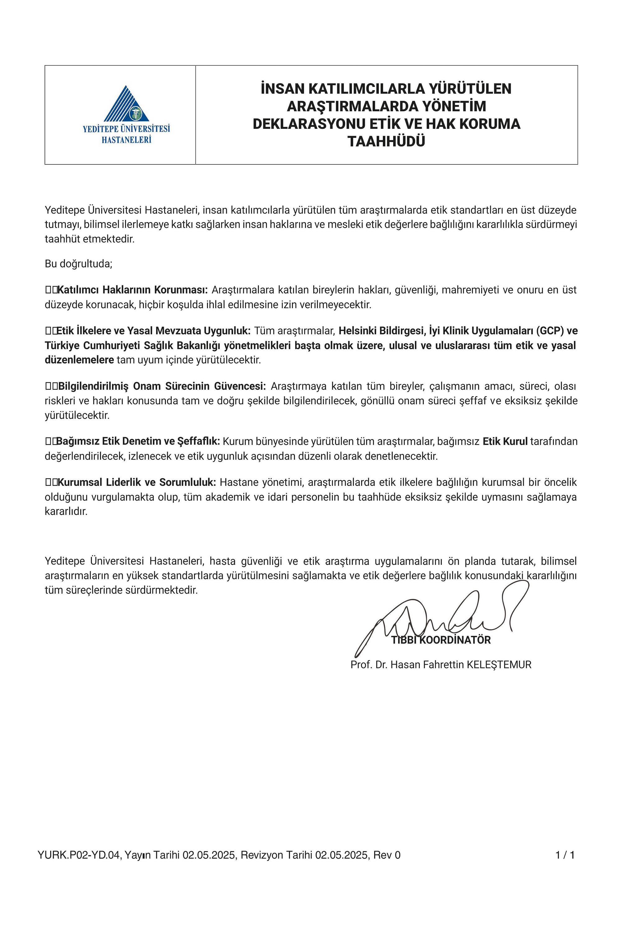 Yeditepe Üniversitesi Hastaneleri, sağlık hizmetlerinin sunumunda etik ilkelere bağlılığı temel bir kurumsal değer olarak benimser. Tüm klinik ve idari süreçler; hasta haklarına saygı, profesyonel dürüstlük, şeffaflık, tarafsızlık ve hesap verebilirlik esasları doğrultusunda yürütülür. Etik çerçevemiz; hastalar, hasta yakınları, sağlık çalışanları ve tüm paydaşlar için güvenilir, adil ve saygılı bir hizmet ortamı sağlamayı amaçlar. Bu kapsamda, aşağıdaki etik ilkeler sistematik bir yapı içinde uygulanmakta; kurum genelinde tutarlı, izlenebilir ve sürdürülebilir şekilde hayata geçirilmektedir: