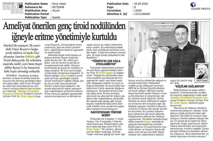 İstanbul’da yaşayan 36 yaşındaki Ozan Buçan'ın boğazında takılma ve baskı hissi oluşması üzerine doktora gitti. Tiroid dokusunda 36 milimetre çapında nodül, yani beze tespit edilen Buçan'ın bu bezesinin kötü huylu olmadığı anlaşıldı. Kendisine ameliyat önerilen ve beze ile birlikte tiroid dokusunun da alınması gerektiğini öğrenen genç adam, kötü huylu olmayan bu nodül için tiroid dokusunun alınmasını ve boynunda bir kesi izi olmasını istemedi. Yeditepe Üniversitesi Koşuyolu Hastanesi Endokrin Cerrahisi Uzmanı Prof. Dr. Erhan Ayşan'a başvuran Buçan'a, ultrasonografi cihazı yardımıyla, iğne ile eritme yöntemi yani, radyofrekans tedavisi uygulandı ve nodül eritildi.